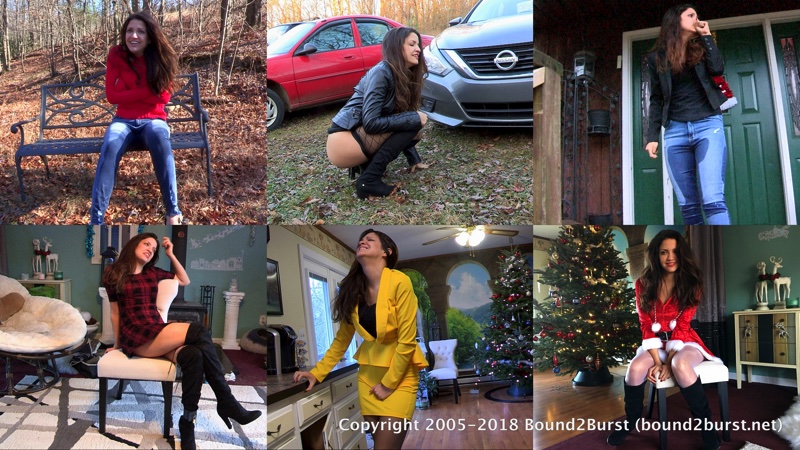 A man arrives at the passenger's window of Jasmine's car as she arrives home from work. He says he has rigged her home with multiple cameras and a very large device in the basement which, if triggered, would raze the property to the ground. He tells the girls that she must do exactly as he says or he will detonate it with her inside the house. Jasmine is squirming, making it clear that she needs to pee. The man tells her to enter the house and carry on as she normally would, but she must not, under any circumstances, visit the bathroom or pee into a container of any kind. Instead, she must hold her pee until she receives a call telling her she can relieve herself. Jasmine panics, pointing out that she is desperate to pee; the man is unmoved by her pleading, and tells her to do as she is told. Jasmine enters the house, squirming in desperation, and sets about performing chores, badly distracted by her very full bladder. She adds a little water to the Christmas tree, not really the best option when she is on the verge of pissing herself, and even considers washing the dirty dishes, but getting her hands wet would be even worse. Instead, Jasmine decides to start cooking to distract her from her dilemma. It's no good; she's bursting. Standing in front of the cooker, she loses control and soaks her legs. Did the man see? What will happen to her now?