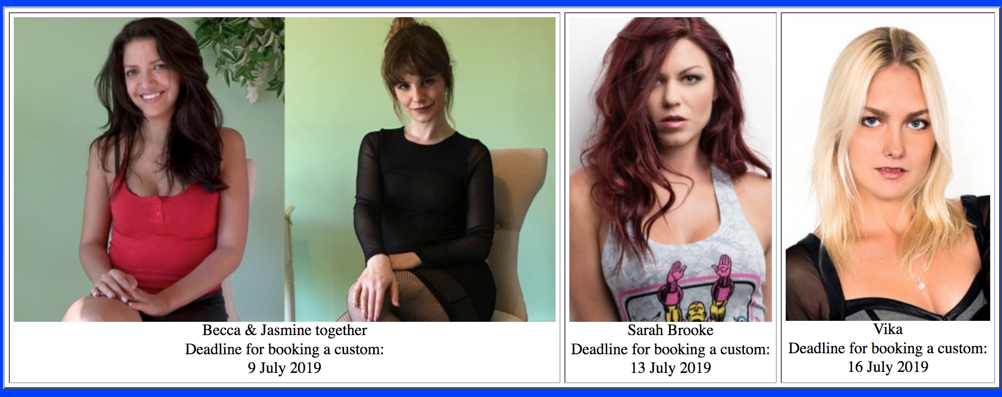 Sarah Brooke returns around mid-month, so same story with customs for her. Vika is here a few days later. Her schedule is pretty full but we can still fit one more custom in. Sarah and Vika won't be back for quite some time, so don't miss your chance!