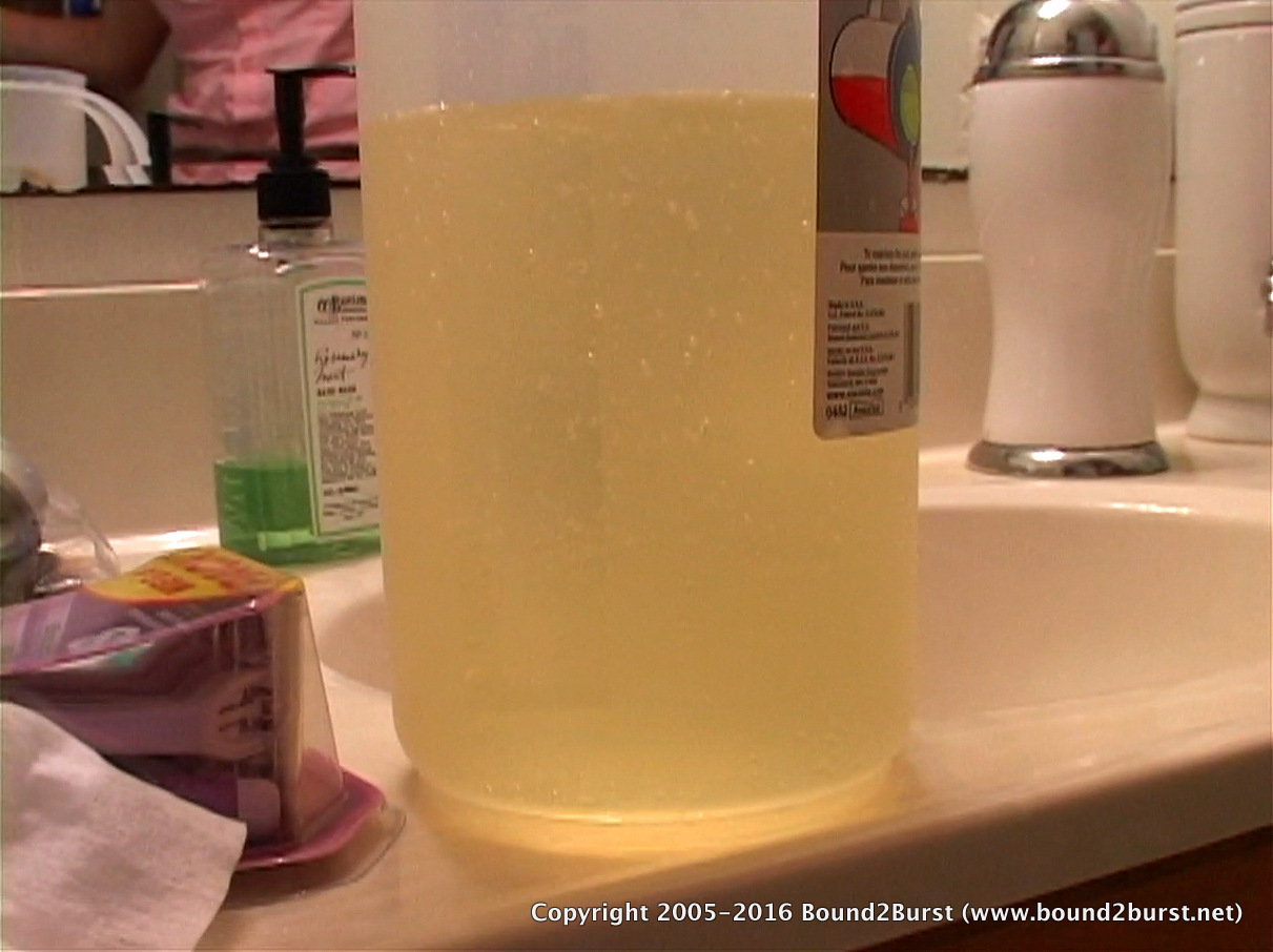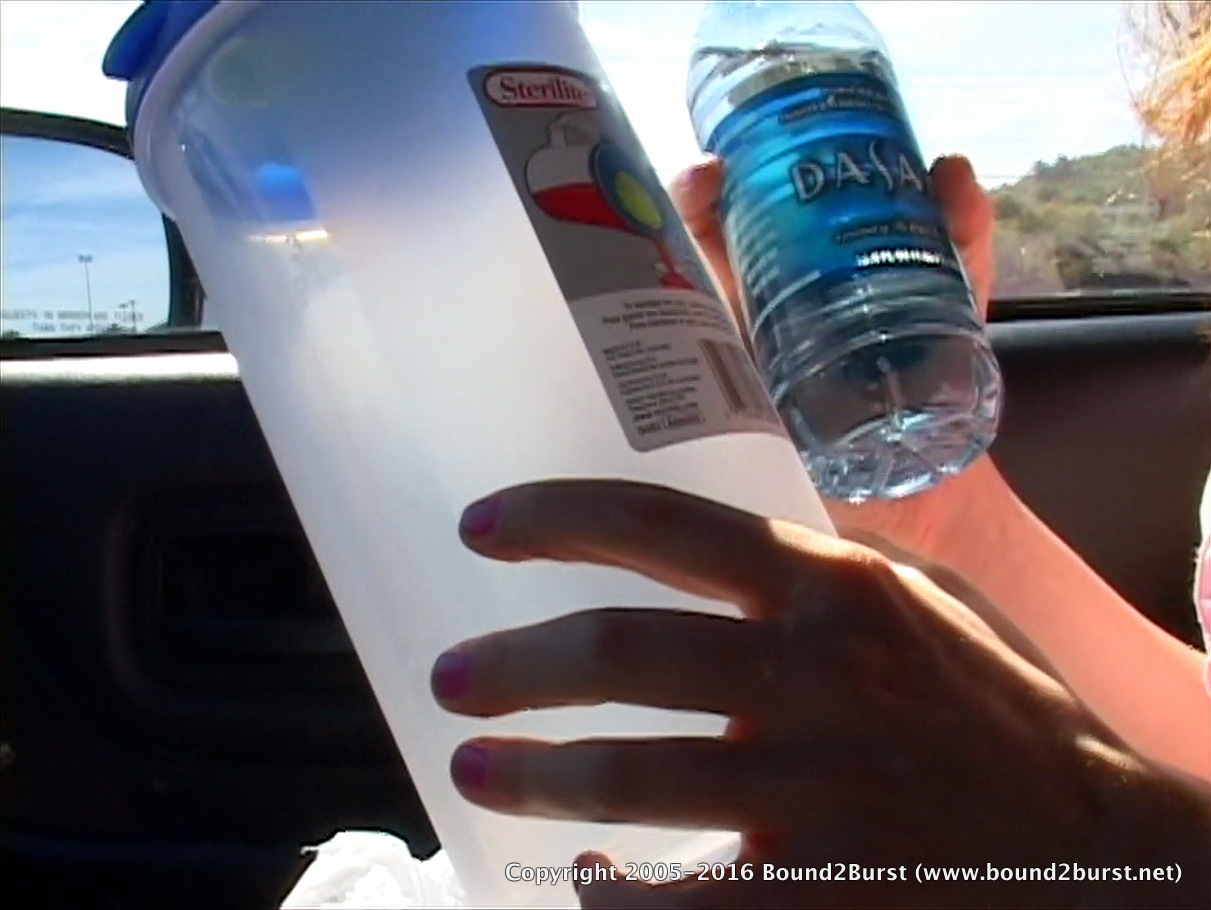 This is the one that began the whole bladder capacity trend on Bound2Burst, before the days of the custom which led to the purchase of the graduated scientific cylinders in regular use today. The objective in "Full Capacity" was never that serious, though many have taken it so and speculated somewhat larger amounts than Jayne actually peed. This larger, clearer, re-edited version should set the record straight. It's all very informal: Jayne had to hold her pee, which drinking, as we ran some errands which included a trip to the hardware store to purchase a graduated jug to measure how much she peed when she finally got to go. On the return journey, we actually encountered a Full Capacity and Jayne became very anxious - by this time she was wickedly desperate and worried that he would not be able to hold on until we got back to the house. She managed it, just, and released a loud torrent of pee into the jug at the earliest opportunity. While the jug was graduated, it was only coarsely so and the graduations were far from clear on video. At the end of the movie, a still of the jug just after purchase is included which just shows the 3-pint graduation. The jug is tilted at an angle, but with a little simple geometry one can work out the curve of where the liquid would be were the jug the upright. The label on the jug serves as a good marker to compare with the second still which shows the jug filled with Jayne's pee, and makes it possible to see that she really did release 1,400 milli-litres, plus a little spilled on the floor. These two images are also included separately here on the site.