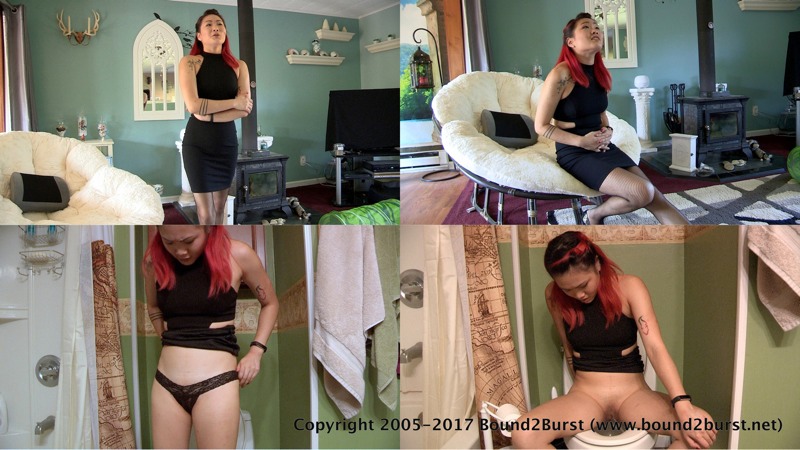 Lea needs to pee but has been asked to hold it for a while. She looks very anxious as she wiggles her legs, sits and stands, her expressions both distracted and strained. She is encouraged to keep waiting even when she believes she can't hold on any longer, but eventually there comes a point where she feels she simply has to go. She stands and heads for the bathroom, slowed down by having a cameraman in her way. At last, she is able to pull her pantyhose and panties down and sit on the toilet. For a girl with a small bladder, waiting can really be torture.