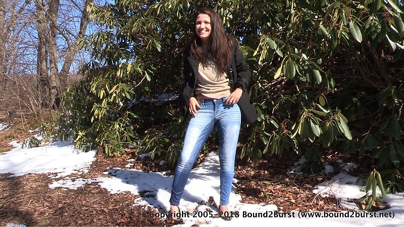 It was an unusual day for Jasmine in that we filmed a lot of bondage content; all one big movie in fact. Along the way, Jasmine was working on coffee and water until she needed to pee. Quite early on in a scene where she is secured to a chair with a lot of duct tape (real duct tape from which she could not escape), she announced that she needed to pee. She was told she would have to wait until this part of the story was complete owing to the difficulties involved in cutting her out of the tape, her changing clothes, then later changing back and being taped up again, all of which would use up a lot of time. It would be far more efficient, she was told, if she were to hold it. Poor Jasmine. She agreed, and we carried on working. Along the way, she did fidget a little because it was hard not to wiggle when needing to pee so badly, but she managed to get through it. Looking at the timeline for the video, she was taped to that chair for over 30 minutes. It also took about five minutes to cut her out and peel the tape off. After that, she had to change to go out into the cold. This means that by the time we started filming this video, Jasmine had wanted to go for about 40 minutes, and was asked to wait another twenty. She found it hard to do but she somehow managed it. Even though it was pretty cold out there, she said afterwards that pissing her jeans had never felt so good.