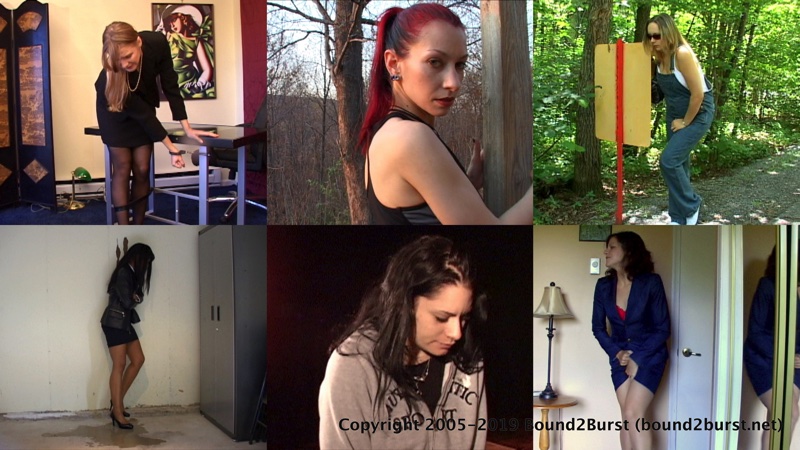 Original description: Melanie works in an office which is being robbed. One of the thieves has taken her to a storeroom and is keeping her locked in there while the robbery is in progress. He asks Melanie how many cameras are in the building, but her answer is not entirely lucid because she is seriously bursting to use the bathroom. At first, Melanie is tense and keeps moving around restlessly, but this soon builds to a frantic pee dance as she struggles not tow wet herself. The thief leaves her for a while, and she finds herself wishing he would come back so that she can negotiate with him for the use of the bathroom. When he does return, he is intractable and makes Melanie stand there wiggling and crossing her legs in humiliating desperation. The thief tells her they will be done in a few more minutes, but Melanie cannot wait that long. Pee explodes out of her, pouring down her legs and literally gushing into her shoe from which it jets back out onto the floor. Melanie's embarrassment is acute, but this turns to dismay when the thief leaves her locked in the store room. Eventually, she sits down in her wet skirt to wait for someone to find her, glancing uneasily at the big puddle on the floor that is the first thing her rescuer will see. (The peeing sequence is recorded from two angles).