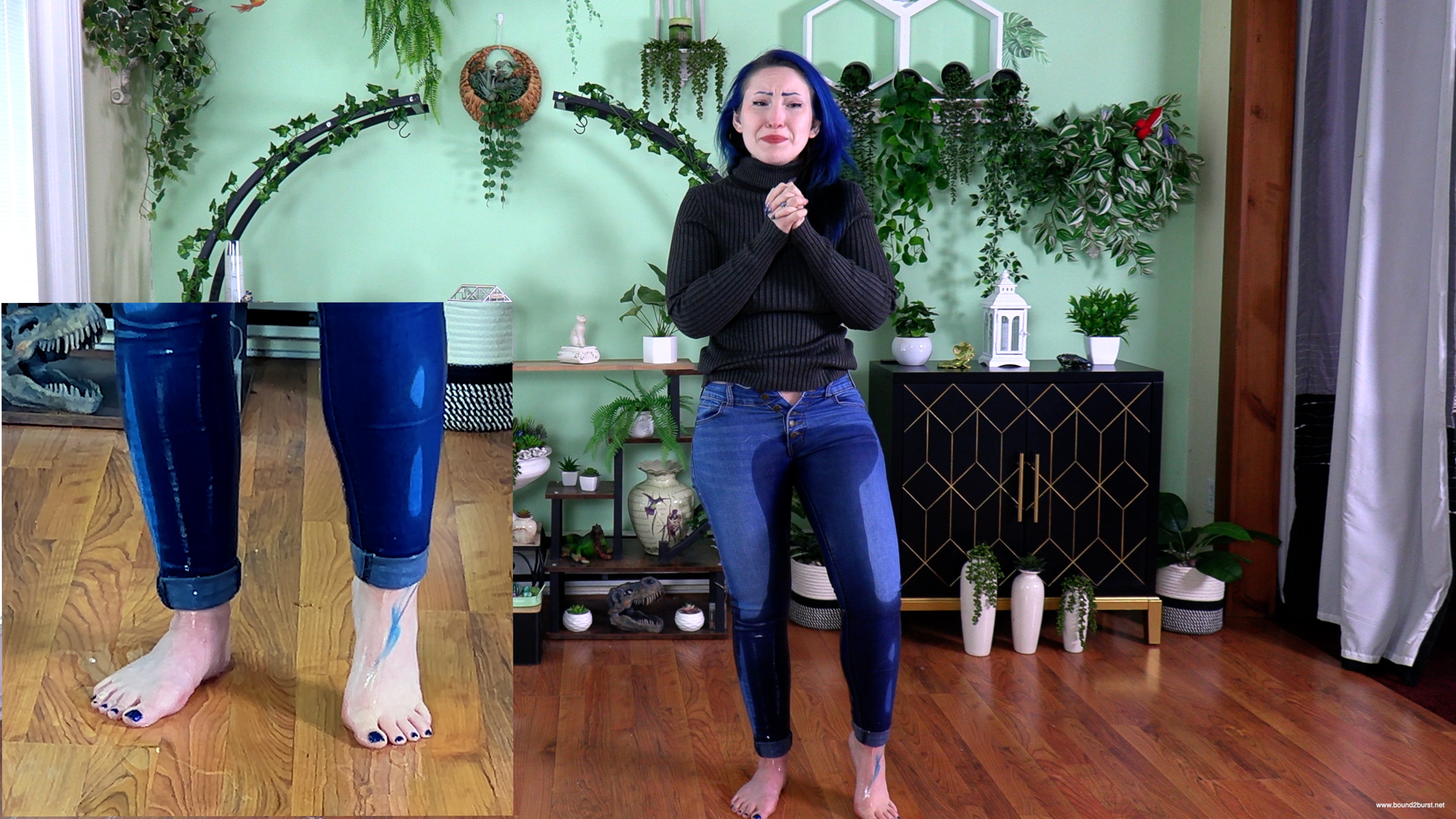 were tied and the waistband of the jeans was pressing on her abdomen. Niki rocks from side to side, crosses her legs and bends her knees and she struggles to keep holding her pee, but it is obviously