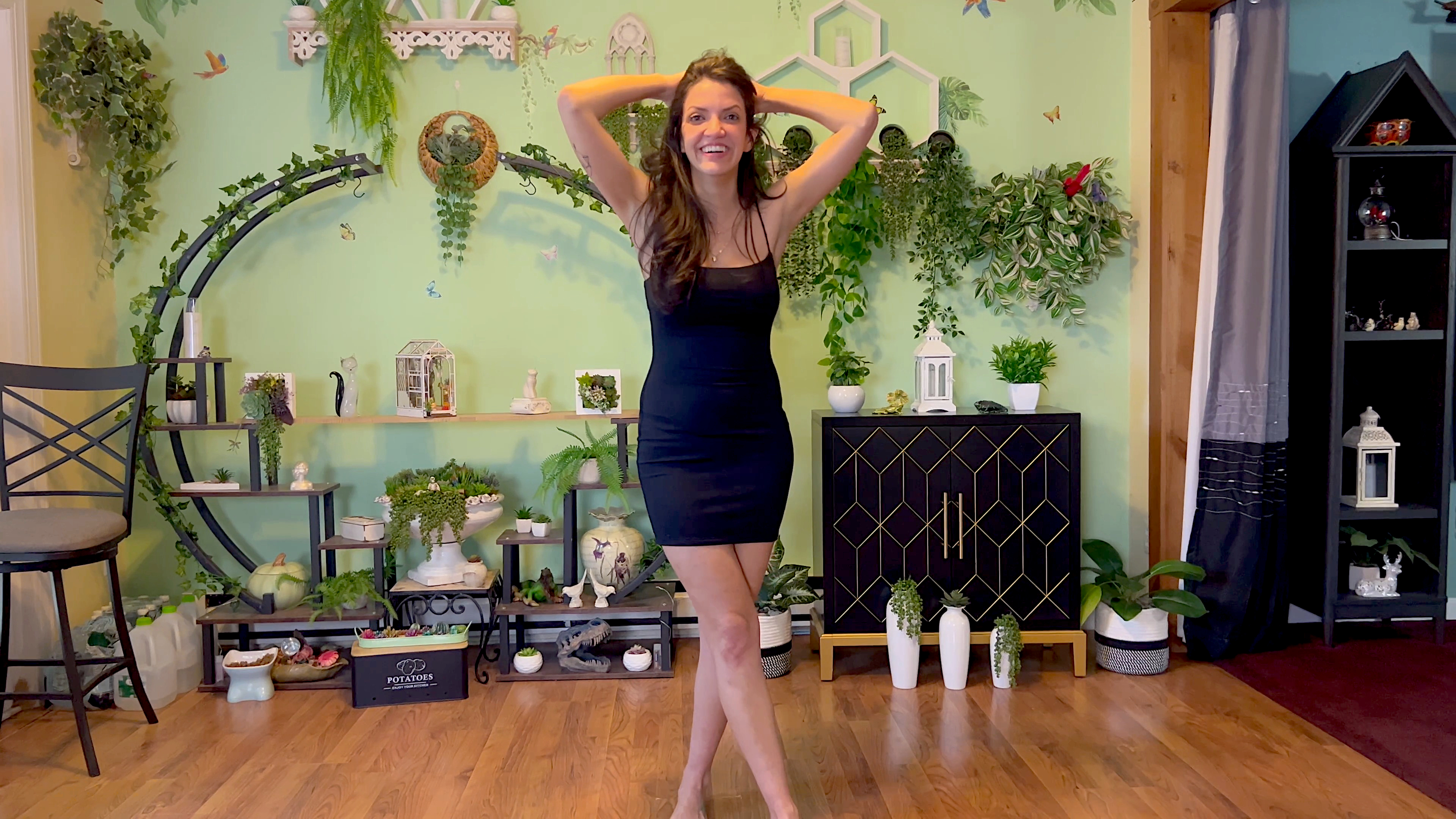 After just a few minutes on the imaginary dance floor, she loses control and wets herself, creating a very large puddle on the floor at her feet.