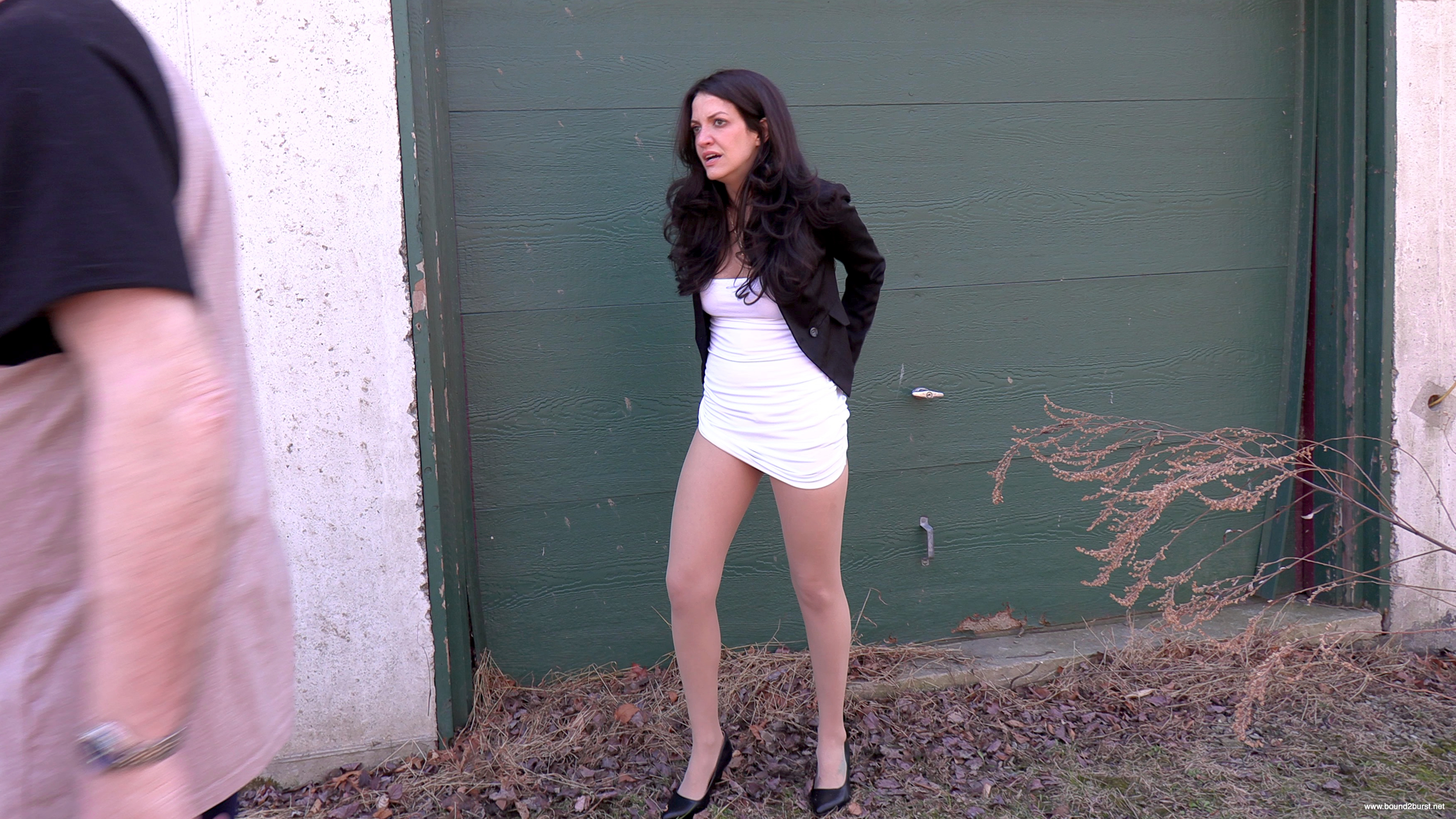 Jasmine has been driven a long distance to a remote location, during which her bladder has filled and she is now desperate to get to a toilet. However, her captor has left