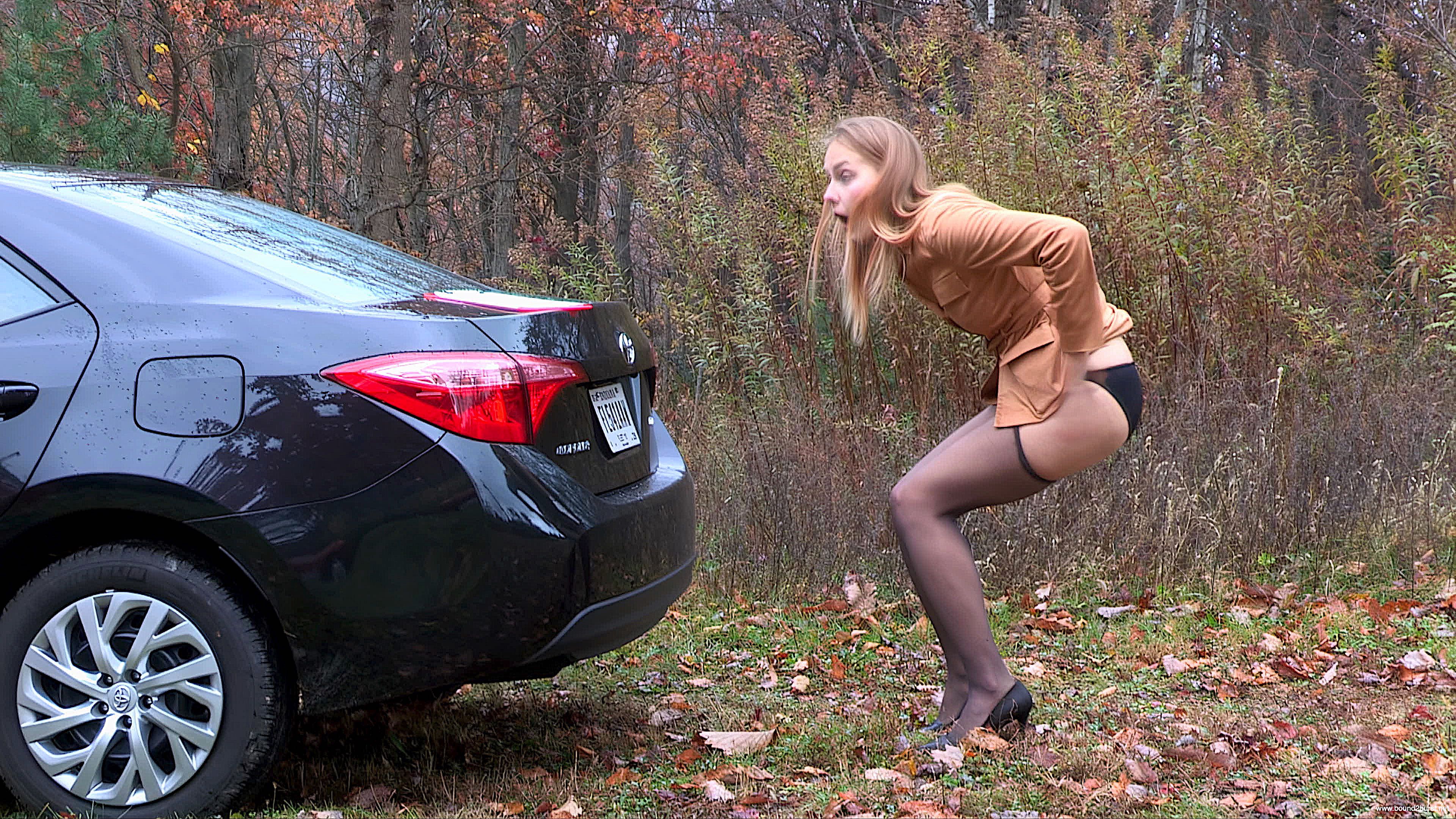 car and use the door to screen her from the house as she pulls down her panties to pee. She does not expect Dave to already be outside, and coming up from behind, he surprises her